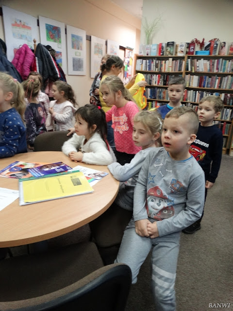 W czytelni, zaraz po wejściu, panował cichutki gwar. Gdy mali goście się ogarnęli, zaczęło się niecodzienne (sądze) dla nich spotkanie. Dzieci na zadawane pytania odpowiadały chętnie, z naturalnym przejęciem i były ciekawe wszystkiego.